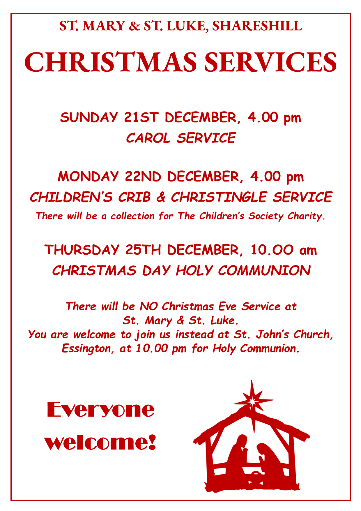 Christmas 2025 services at Shareshill Click here for times of services other than Christmas. For all church enquiries please contact Revd Helen Duckett, Interim Minister of Essington, Featherstone and Shareshill 2024 saw Shareshill churchyard winning yet another pair of awards; following on being joint winner of the of Lichfield Diocese Churchyard of the Year 2023 History of the church building Up to date details of all services at Shareshill Church are on the official Shareshill Church website . Click on the link to see an Interactive tour of Shareshill Church courtesy of Wolverhampton University. |